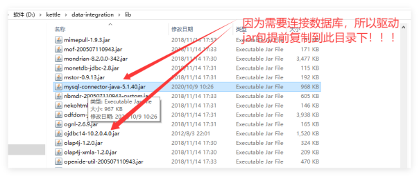 备注:连接数据库前,需要 添加 驱动 Jar包 ( mysql, oracle,hive共三个jar文件 ) 后一定要记得重新启动Ke ttle ,否则无法生效 : 报错,找不到驱动的类等。
