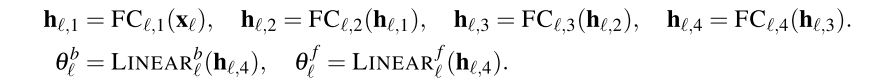 核心组件是也是两部分,第一个由四层全连接层的FC Stack,输出两个 "基扩展系数":正向系数θf(用于生成预测y)和反向系数θb(用于生成回溯拟合x);另一部分是也是两个全连接层,分别接收正向系数θf和反向系数θb,生成部分预测和回溯拟合。