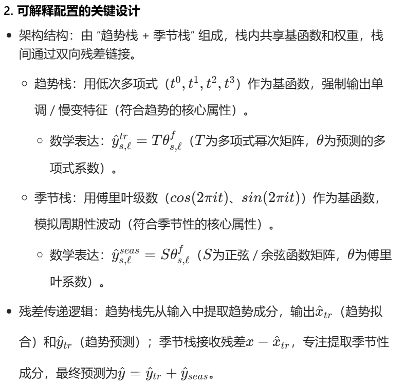 N-BEATS 通过两种配置实现 "通用泛化" 与 "可解释性" 的平衡,可解释配置通过注入趋势 / 季节性归纳偏置,将预测分解为人类可理解的成分,且无明显性能损失。