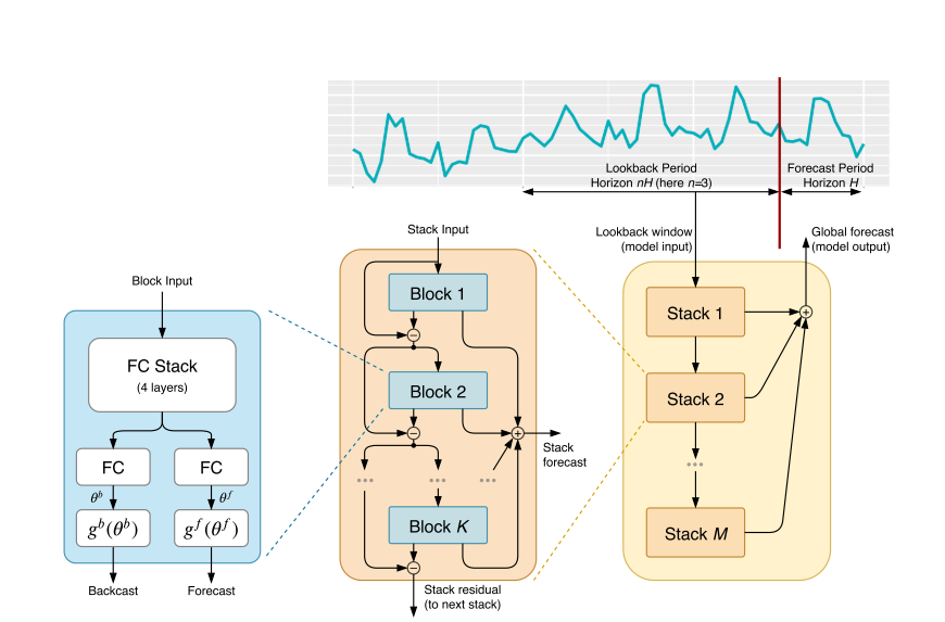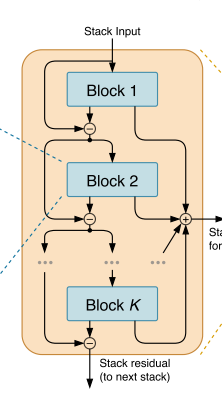 双向残差堆叠(Doubly Residual Stacking),这是 N-BEATS 的拓扑核心,解决了传统残差网络难以解释、训练深层模型困难的问题,同时实现了预测的分层聚合。