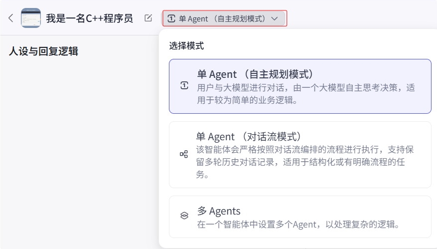 我的智能体的场景比较单一,所以选择:单agent(自主规划模式)。