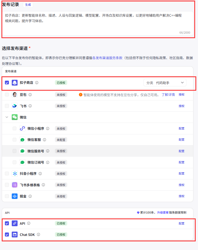 发布部署 :点击右上角发布,选择目标平台微信公众号/抖音/飞书等,填写发布记录(如V1.0:初始版本,支持持产品咨询),完成授权后即可上线 。