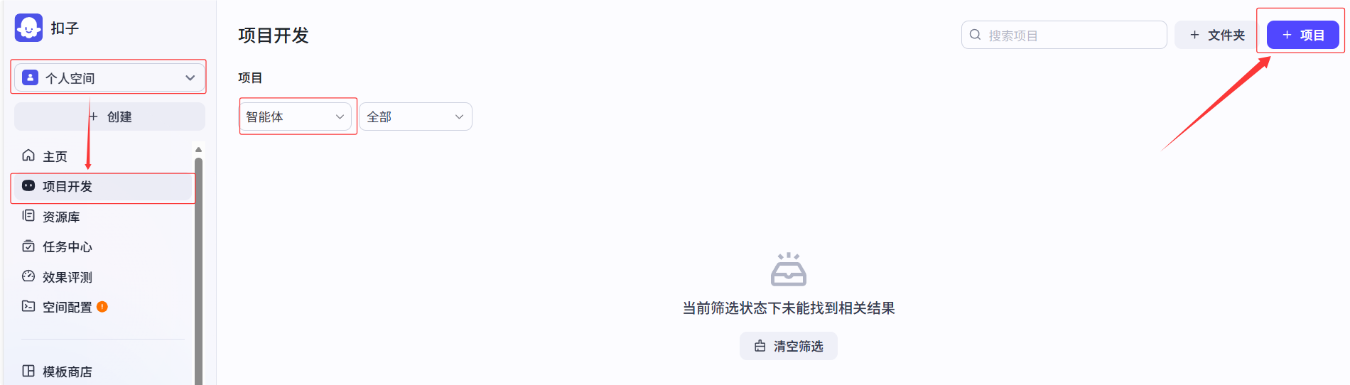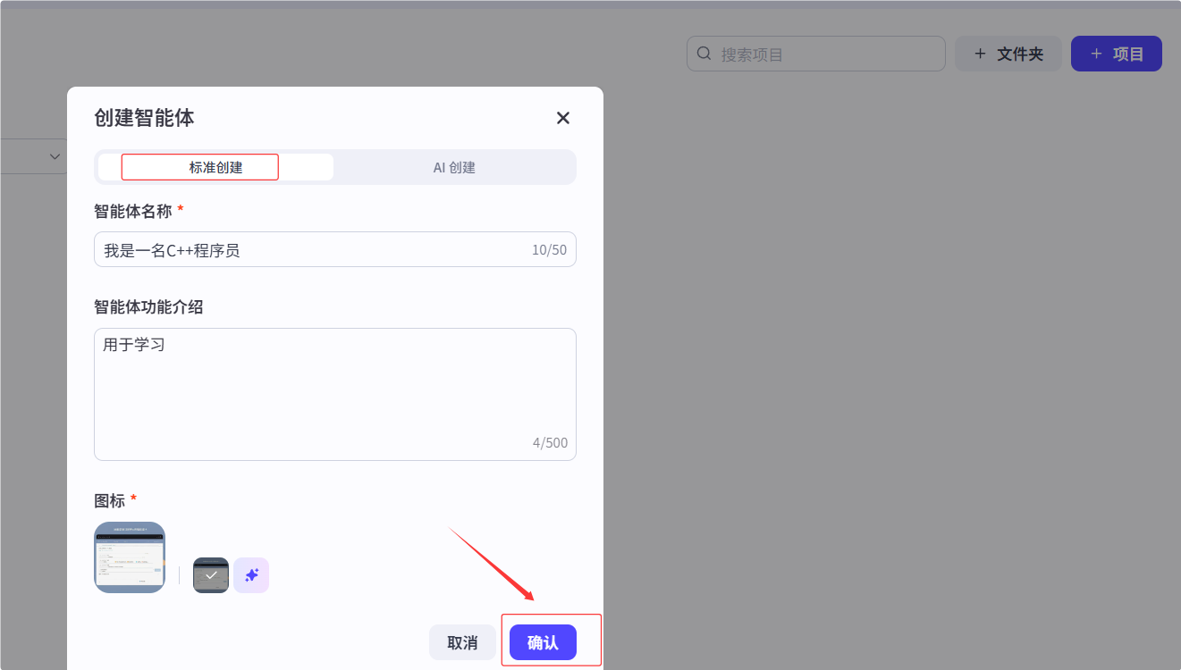 2、进入工作空间,点击项目开发,点击右上角创建智能体,选择创建方式,有标准创建和AI创建。