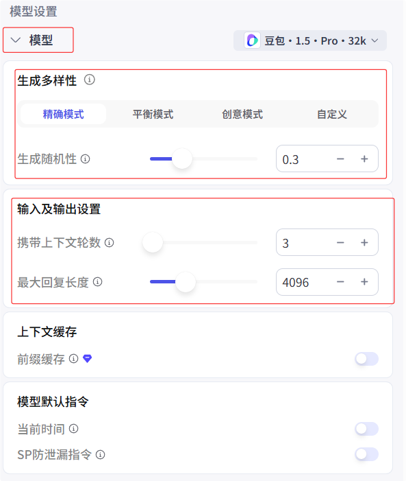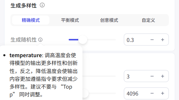 Temperature(温度):控制输出随机性(0~1)。推荐使用系统配置的。低值(0.1~0.3):输出更确定。