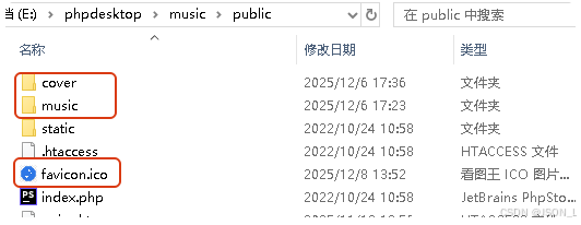 创建cover和music目录,存储封面和音乐文件,favicon.ico为项目icon文件。
