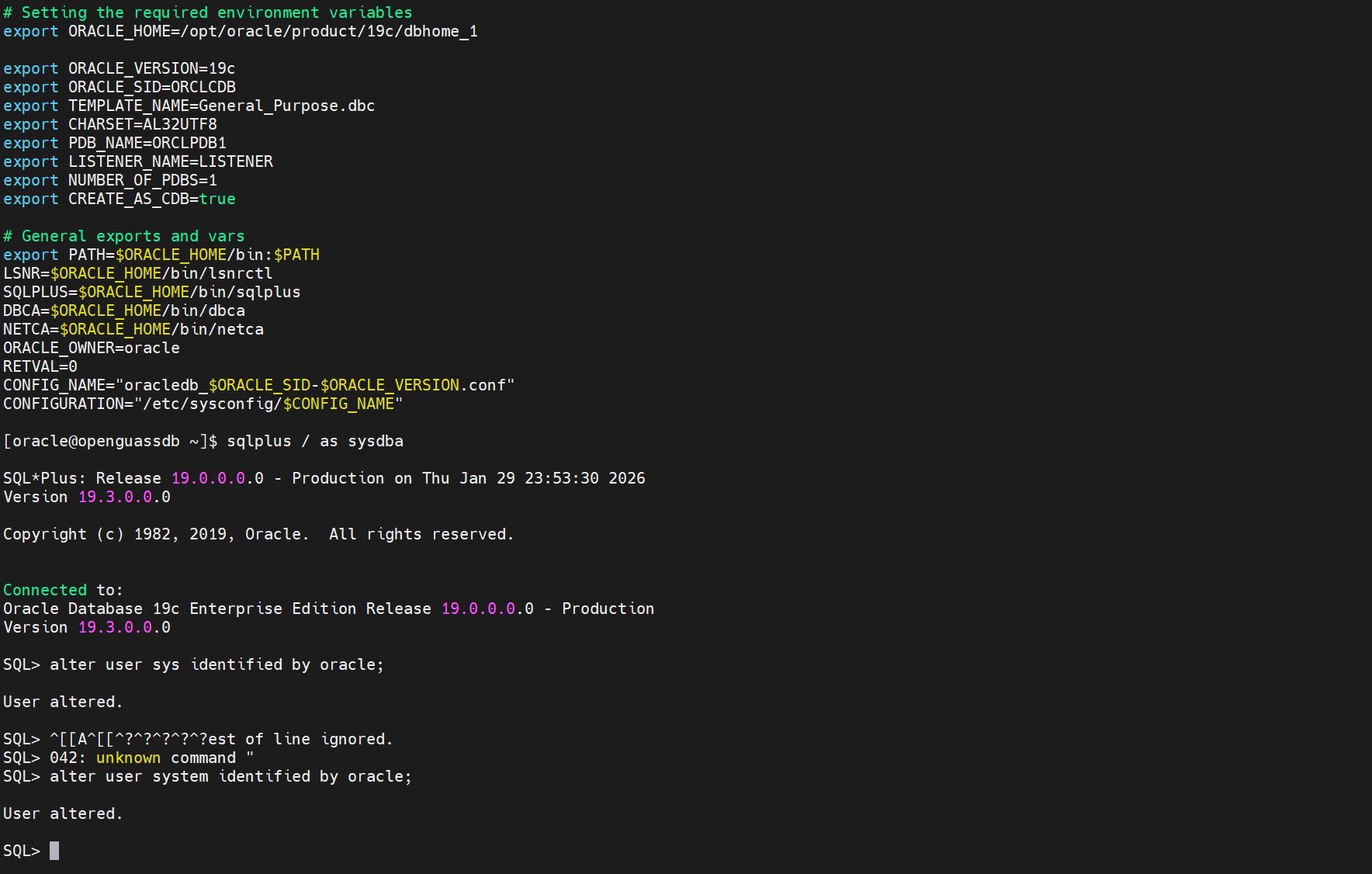 把刚刚脚本中的/etc/init.d/oracledb_ORCLCDB-19c 下面这段粘贴过来。然后给sys system 改个密码就ok了。
