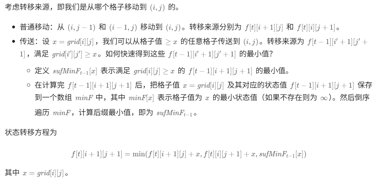 在有传送的情况下,可以用一个额外的维度表示传送次数。定义 f[t][i+1][j+1] 表示++在恰好使用 t 次传送的情况下,从左上角 (0,0) 到 (i,j) 的最小总成本。++