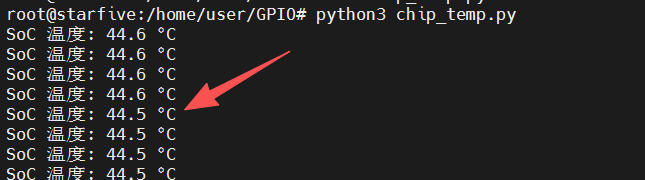 python3 chip_temp.py指令; - 连续打印实时 SoC 温度数据