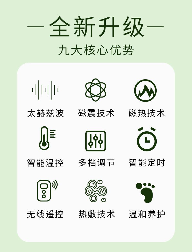 | 5大核心科技组合 | 太赫兹深层渗透+PEMF脉冲+智能调控等 | 全方位满足养生调理、放松舒缓需求 |