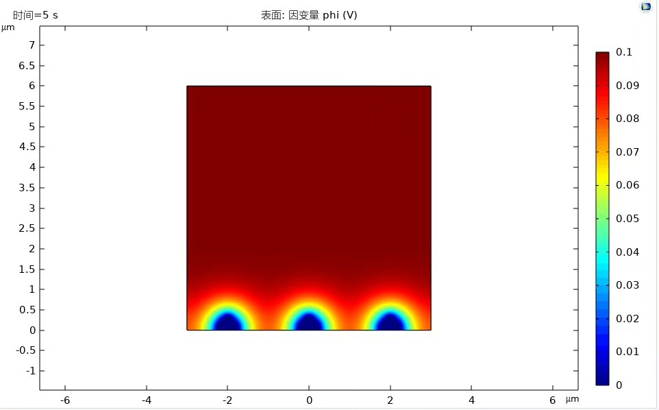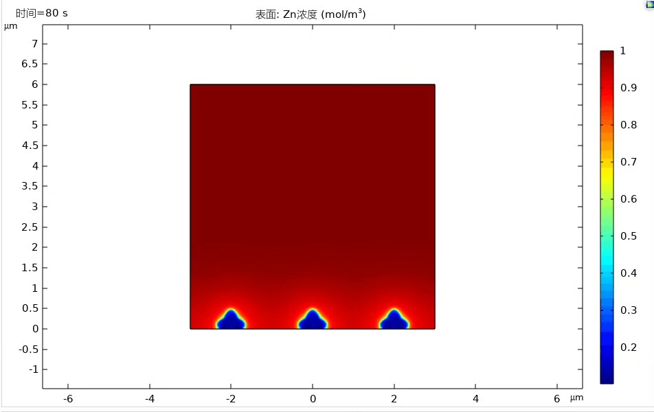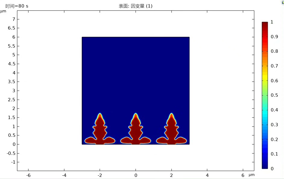 上述代码设定了浓度场、电势场和相场的初始值。在开始模拟时,锂离子浓度为c0*,电势为phi* 0,相场变量phase为0表示没有锂枝晶。随着模拟推进,锂枝晶会从设定的扰动点开始,在三场相互作用下逐渐生长。