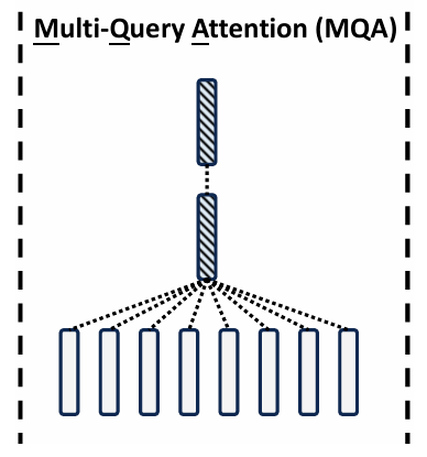 多查询注意力(MQA)通过将多个注意力头的查询共享同一组Key 和Value,从而减少计算和内存开销。