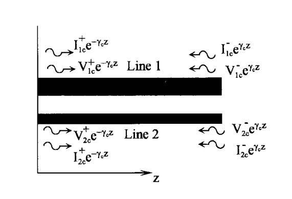 图 4.6 显示了两条均匀耦合的准 TEM 模式非对称传输线。这里做出准 TEM 模式的假设,因为与非 TEM 模式传输线相比,在这种情况下可以定义唯一的电压和电流。设非对称耦合线上的电压和电流波如图所示。线 1 和线 2 上的前向传播电压 波分别表示为V 1 c + e − γ c z V_{1c}^{+}e^{-\gamma_{c}z} V1c+e−γcz 和 V 2 c + e − γ c z V_{2c}^{+}e^{-\gamma_{c}z} V2c+e−γcz ;相应的电流波分别表示为 I 1 c + e − γ c z I_{1c}^{+}e^{-\gamma_{c}z} I1c+e−γcz 和 I 2 c + e − γ c z I_{2c}^{+}e^{-\gamma_{c}z} I2c+e−γcz 。类似地, V 1 c − e γ c z V_{1c}^{-}e^{\gamma_{c}z} V1c−eγcz 和 V 2 c − e γ c z V_{2c}^{-}e^{\gamma_{c}z} V2c−eγcz、 I 1 c − e γ c z I_{1c}^{-}e^{\gamma_{c}z} I1c−eγcz 和 I 2 c − e γ c z I_{2c}^{-}e^{\gamma_{c}z} I2c−eγcz 表示后向传播模式的相应量。
