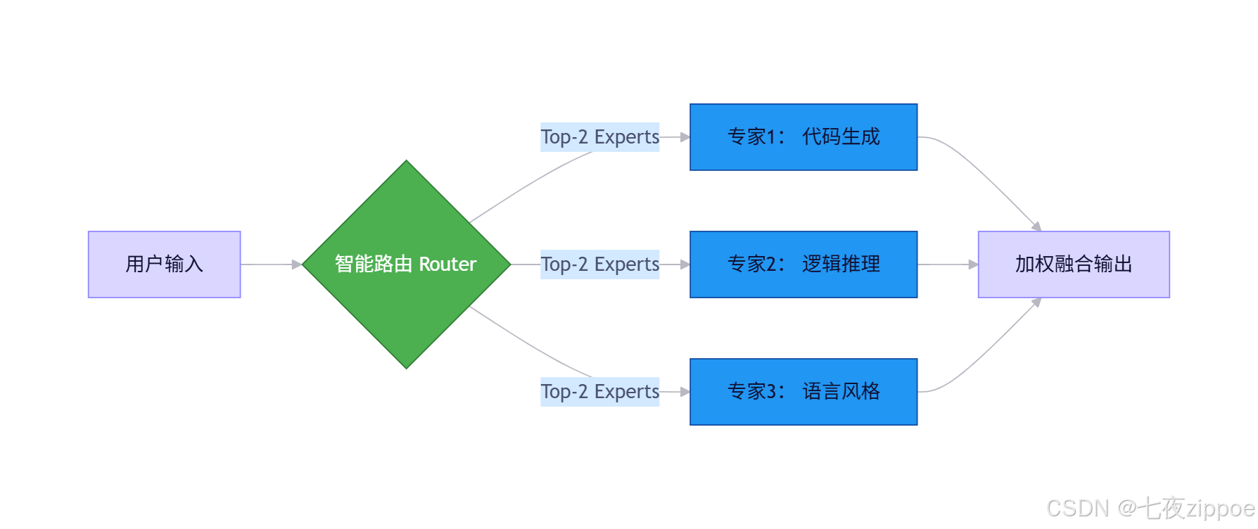 💡 笔者锐评:MoE本质是"术业有专攻"。就像医院分科------你感冒不会挂神经外科,模型推理也该"精准调度"。DeepSeek的路由算法(Gating Network)经我实测,在中文场景下专家选择准确率超92%,比早期MoE方案稳太多。