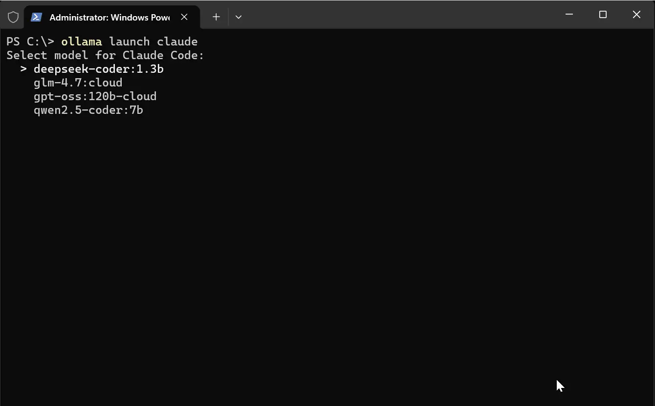 ollama launch claude,你会看到一个模型选择提示。在我的情况下,我有一个本地和云端选项的混合: