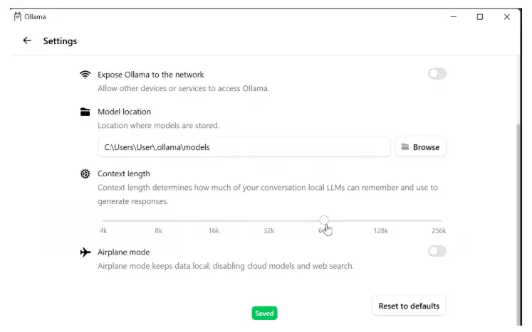 打开 Ollama 设置并更新上下文长度。