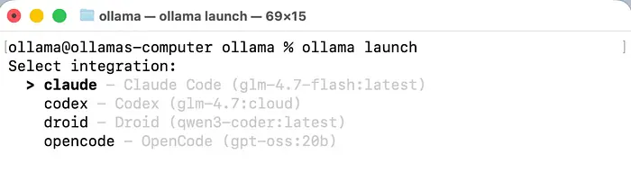 当你运行ollama launch时,会看到一个交互式菜单来选择你想要的集成。