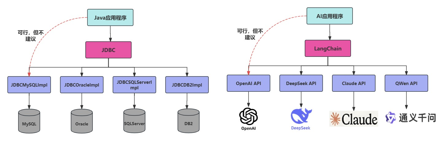 - 学习成本更低:不同模型的API不同,调用方式也有区别,切换模型时学习成本高。使用LangChain,可以以统一、规范的方式进行调用,有更好的移植性。