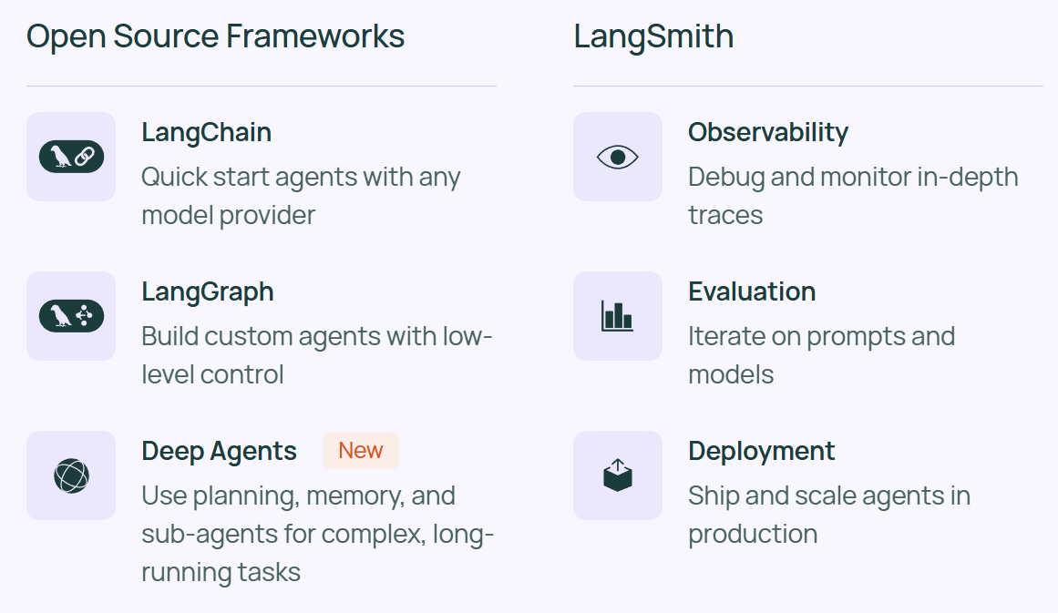 - LangSmith 是一个帮助 AI 团队使用实时生产数据进行持续测试和改进的平台。提供观测、评估与部署功能。