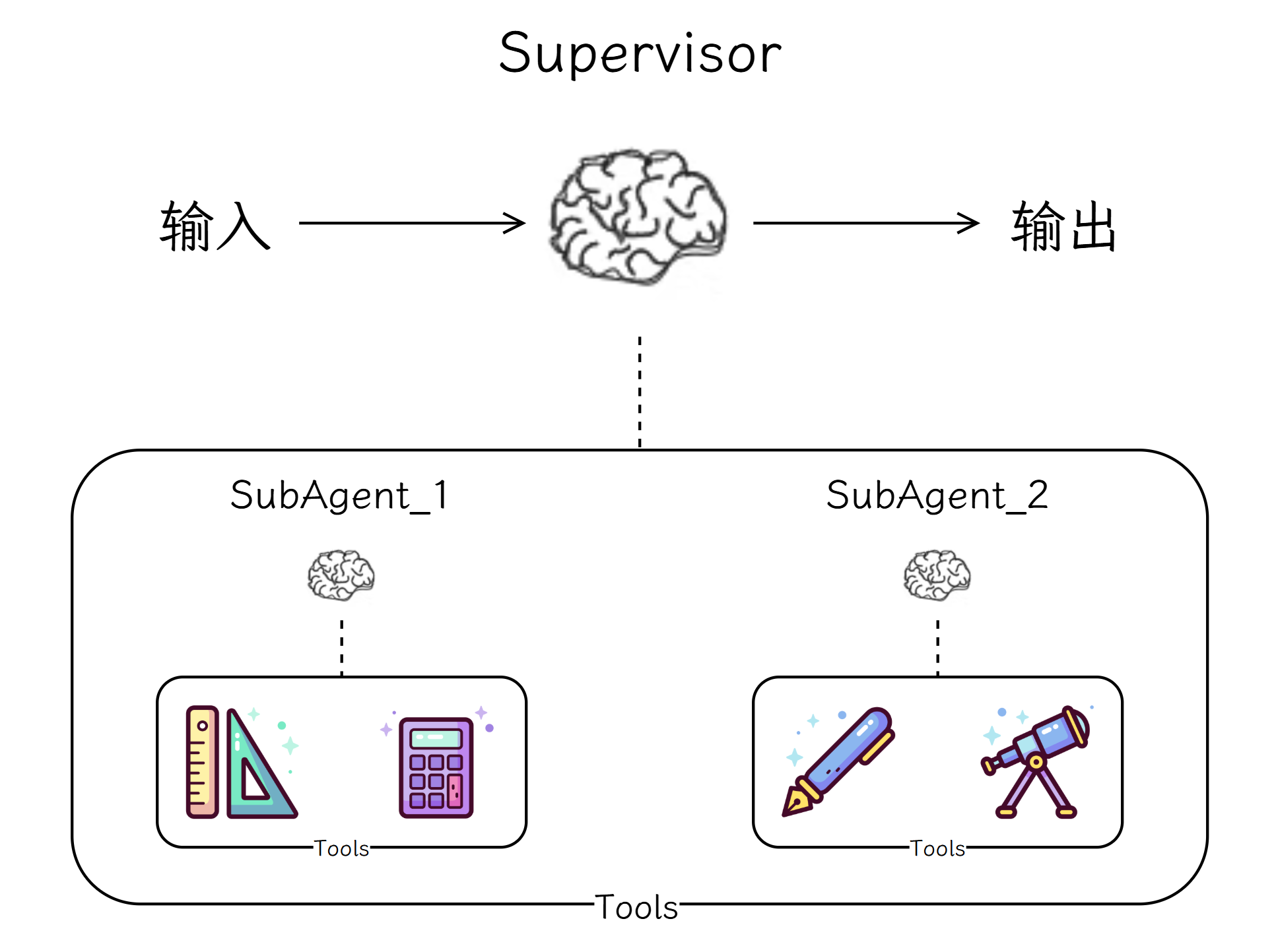 在LangChain 中可以将 Agent 封装为工具,将工具绑定到主管 Agent 来实现主管多代理模式。