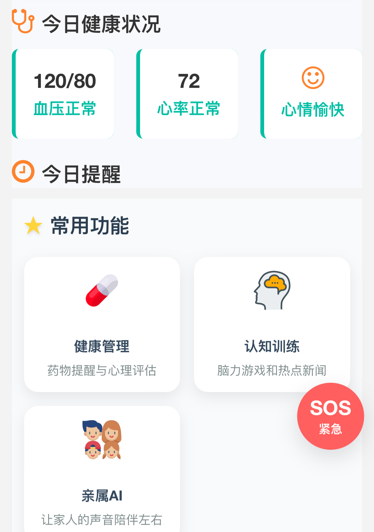 健康是长辈安享晚年的核心,也是我们作子女的最关注的问题。针对长辈常见的慢病管理、用药遗忘等痛点,这款 APP 构建了全方位的健康守护体系。它可智能联动血压仪等健康设备,自动同步检测数据并生成专业清晰的健康档案,对异常指标实时标注提醒,让健康变化一目了然。同时,APP 具备定时用药语音播报功能,精准提醒长辈按时、正确服药,彻底解决忘吃药、吃错药的困扰。完整的健康档案还能为医生诊疗提供科学参考,如同为长辈配备了一位全天候的随身健康管家。而重中之重的 SOS 紧急求助功能,更是为安全筑牢了最后一道防线,长辈触发求助后,子女与急救机构会同步接收实时位置与健康数据,争取宝贵的黄金救援时间,用科技为生命保驾护航。