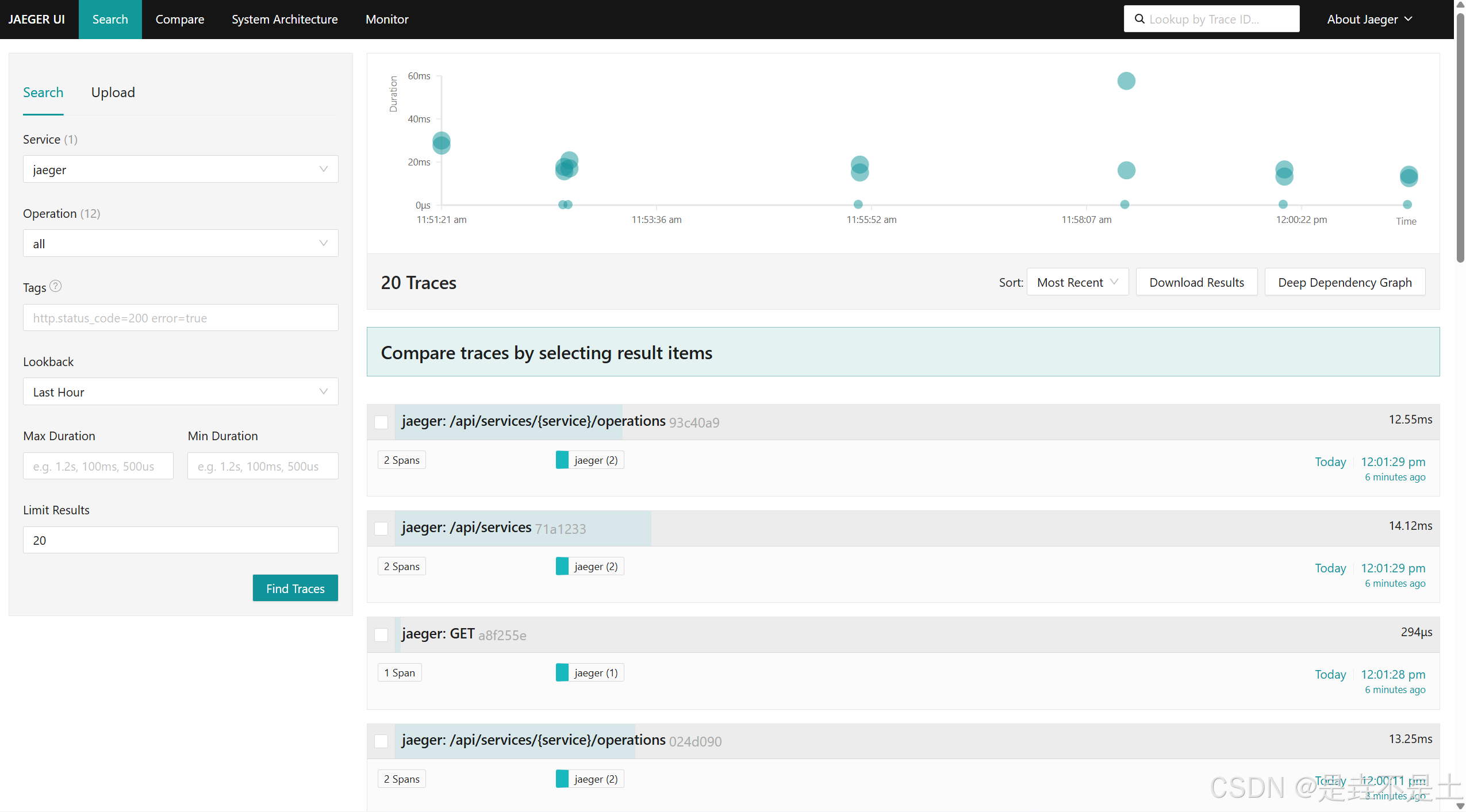 - Jaeger UI:可视化界面,提供链路检索(按服务名、操作名、时间范围、Trace ID 等)、链路拓扑、耗时分析、异常定位等能力,是排查微服务调用问题的 "可视化窗口";
