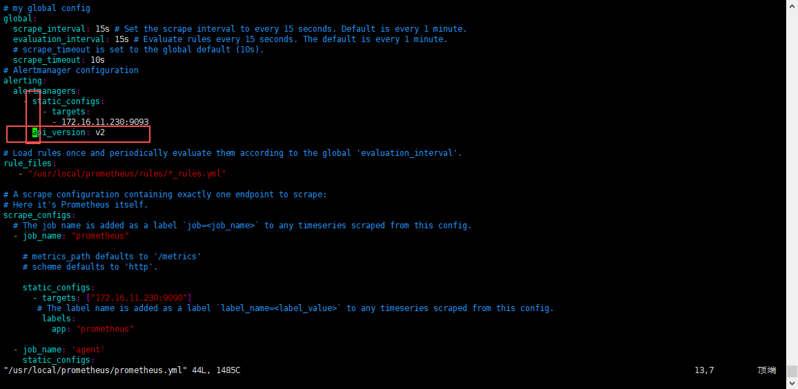 因为现在的Alertmanger使用的是 0.30.0 版本,而从 alertmanager 0.27.0 版本开始,就已经彻底把v1 API 移除了。因此,如果大于0.27.0版本,就需要在 Prometheus配置文件中使用 v2 API,因为Prometheus是主要程序,用来连接alertmanager的,所以,需要在Prometheus中添加这个配置。
