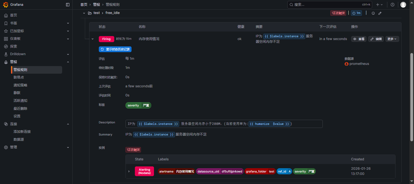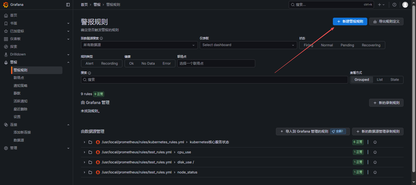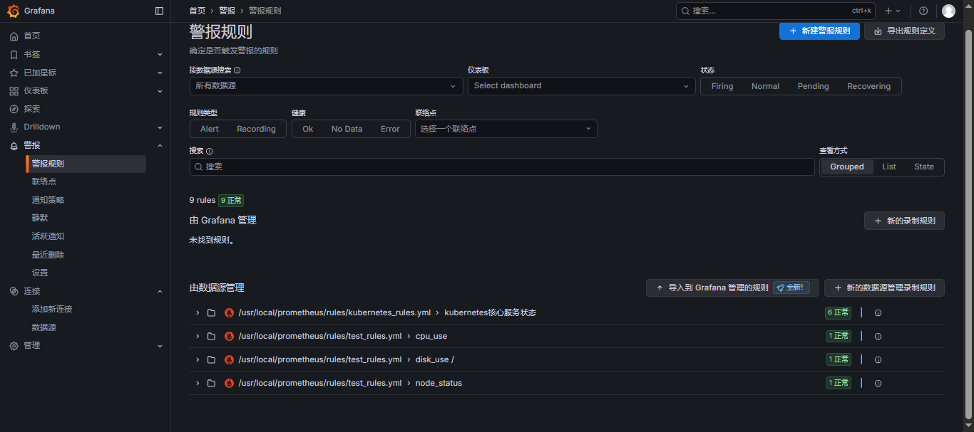 在服务器添加的告警规则,可以直接在Grafana的警报规则里看到,如下图: