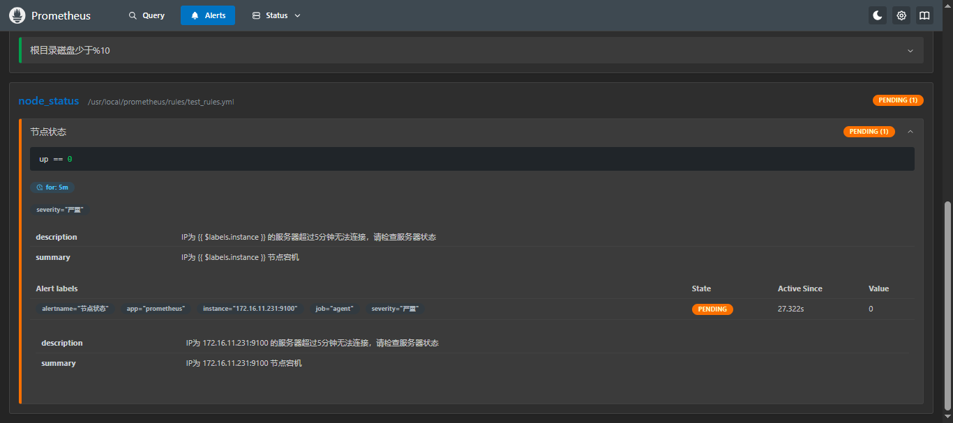 前提是Prometheus必须配置好Alertmanager 告警工具并引入告警规则;