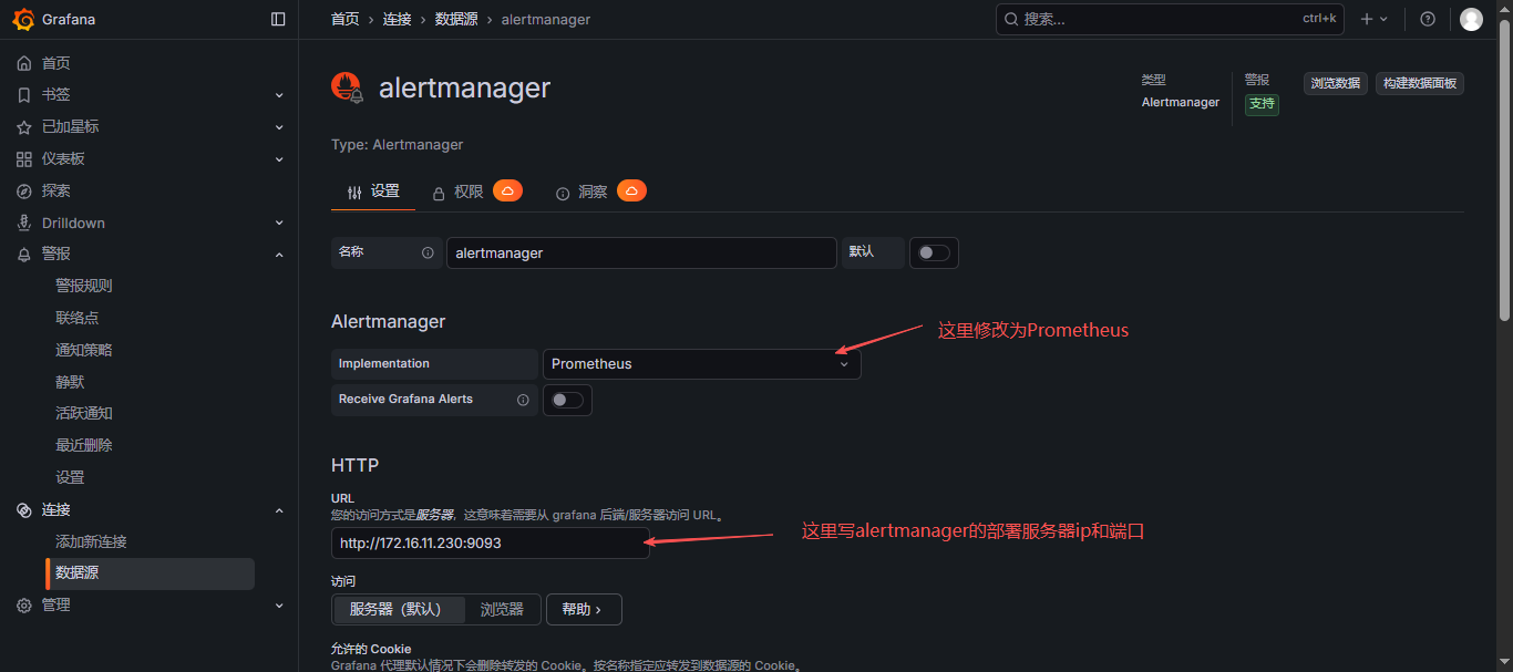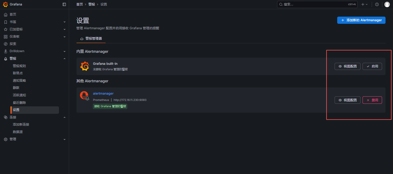 警报 - 设置 - 禁用内置Alertmanager - 启用其他Alertmanager