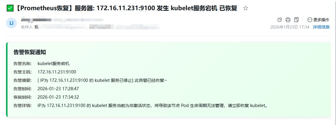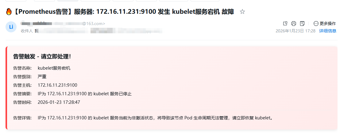 {``{ define "email.html" }}:定义一个名为email.html的模板块,这个名称可以在 Alertmanager 的配置中引用。{``{ .Labels.alertname }}:告警规则名称,同一类故障的标识。{``{ .Labels.severity }}:从告警的Labels中获取severity标签,表示告警的严重性级别。{``{ .Labels.instance }}:从告警的Labels中获取instance标签,通常表示故障主机的 IP 地址或主机名。{``{ .Annotations.summary }}:从告警的Annotations中获取summary,通常是一个简短的告警概述。{``{ (.StartsAt.Add 28800e9).Format "2006-01-02 15:04:05" }}:获取告警触发的时间戳.StartsAt,并将其转换为 UTC+8 时区(28800 秒 = 8 小时),然后格式化为指定的时间格式。{``{ .Annotations.description }}:从告警的Annotations中获取description,通常是一个更详细的告警描述。{``{ end }}:结束当前的模板块或循环。