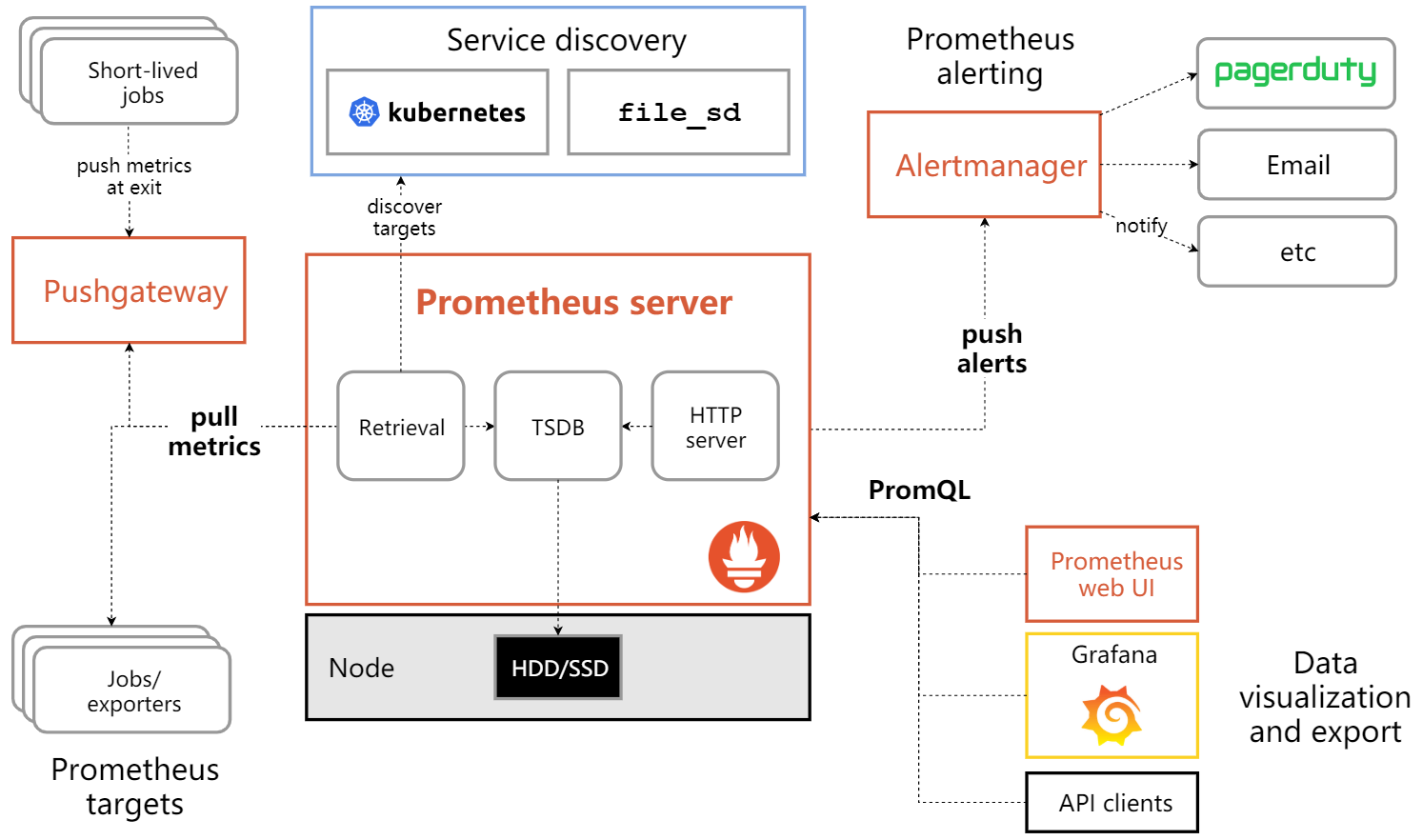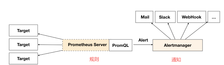 Prometheus的采集与存储机制后,可以先用其 WebUI 或可选的Grafana做可视化;随后再在Prometheus里编写告警规则,当指标达到阈值时,由Alertmanager负责收敛并发送通知,以便及时响应