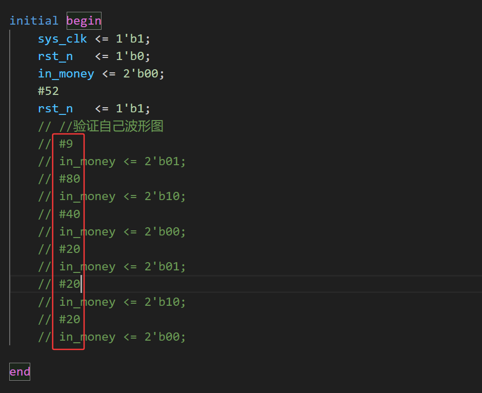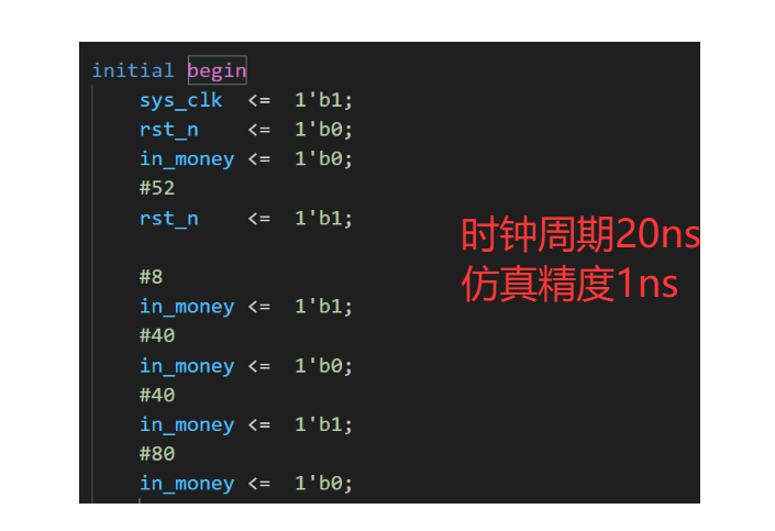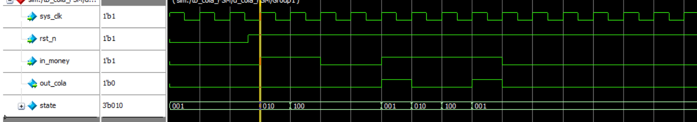可以看到此时光标对准的地方,state在输入in_money跳变时同时跳变到下一状态。这与rtl代码逻辑不符,按照rtl的逻辑应该是state在in_money的下一拍才进行状态转移。