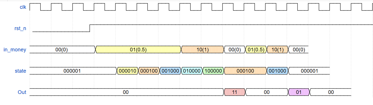 reg [5:0] state; //IDLE:投了0元(000001),s1:投了0.5元(000010),s2:投了1元(000100),s3:投了1.5元(001000),s4:投了2元(010000),s5:投了3元(100000)
