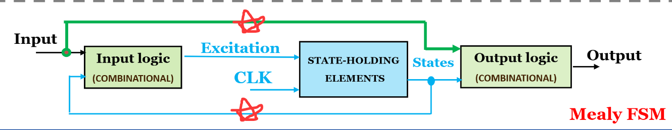 Mealy: 输出取决于 状态+输入(可以看到引了state和input两条线到输出逻辑。)