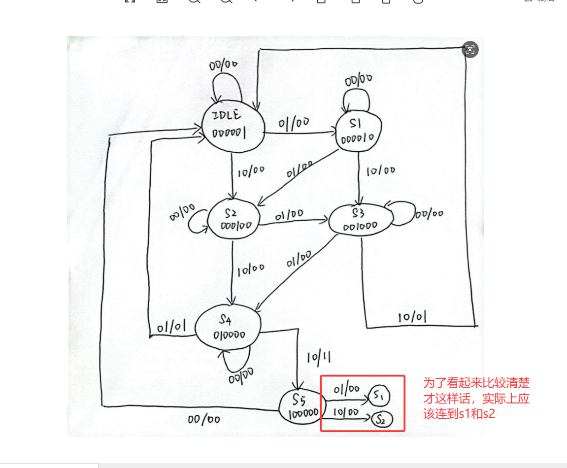 (PS:投入2.5元这个状态可以不用画出来,因为满了2.5直接回到IDLE就可以了,看下图。其实投入3元也可以不用画,参考野火代码27-第二十讲-状态机(三)_哔哩哔哩_bilibili。 而且一般FSM状态机用独热码编状态,其实状态机的状态编码可选择,不同编码各有优缺点。这个也不是特别懂,以后回来填坑。)