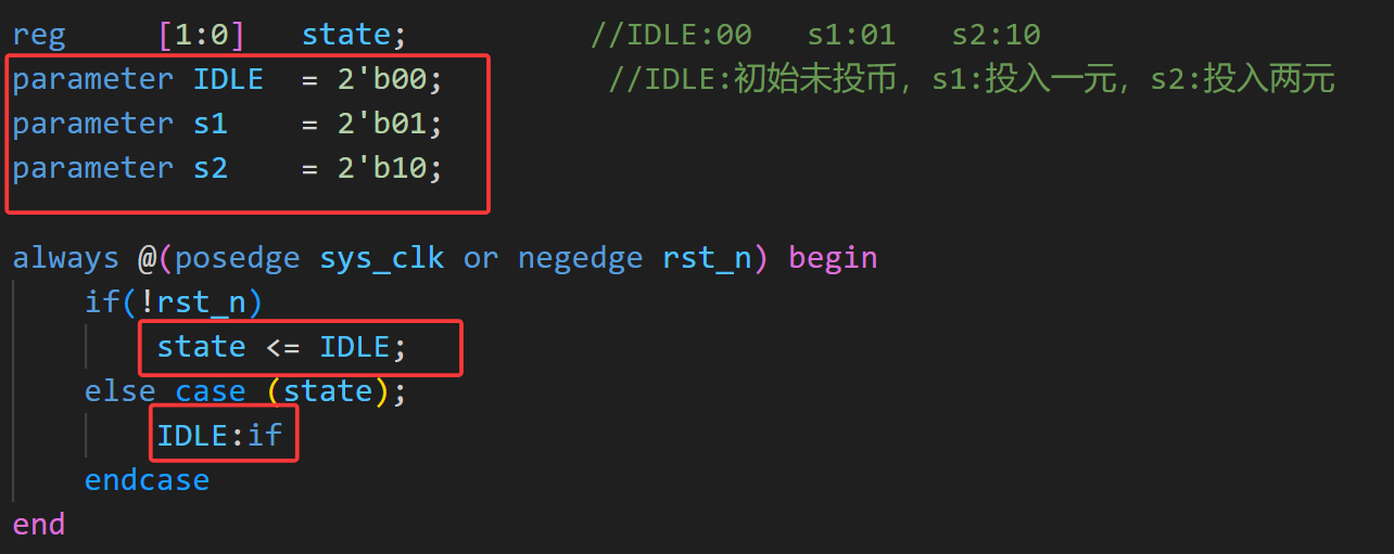 parameter IDLE = 3'b001; //IDLE:初始未投币,s1:投入一元,s2:投入两元