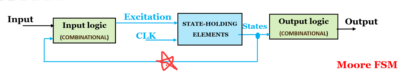 Moore: 输出仅取决于输入(可以看到只引了state到输出逻辑。)