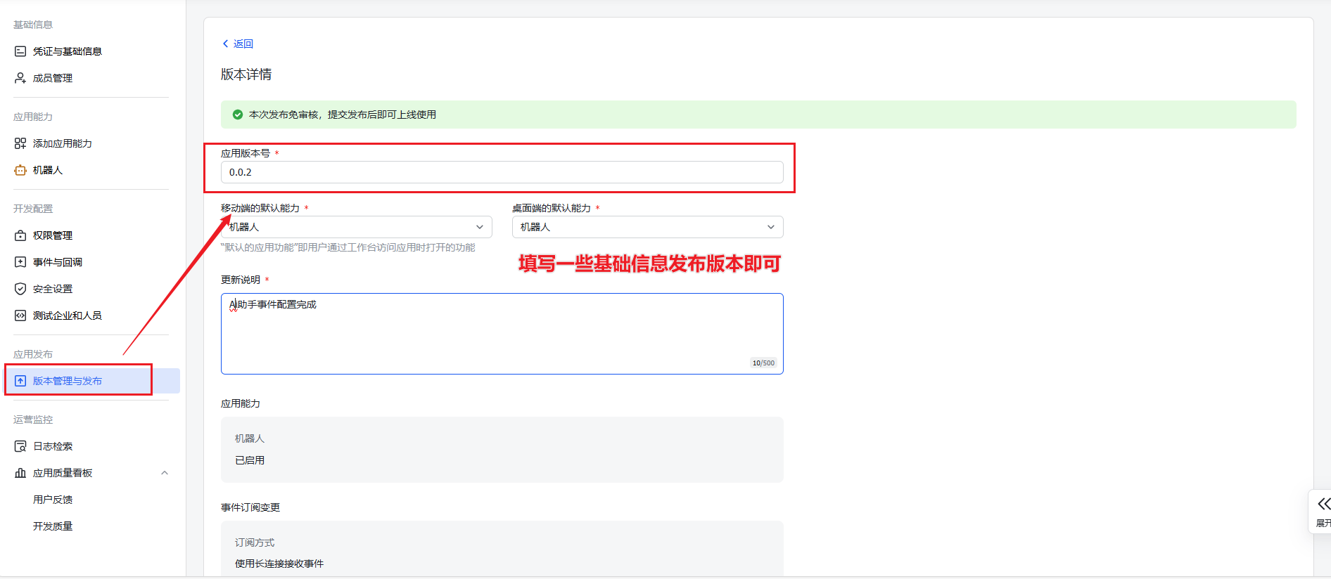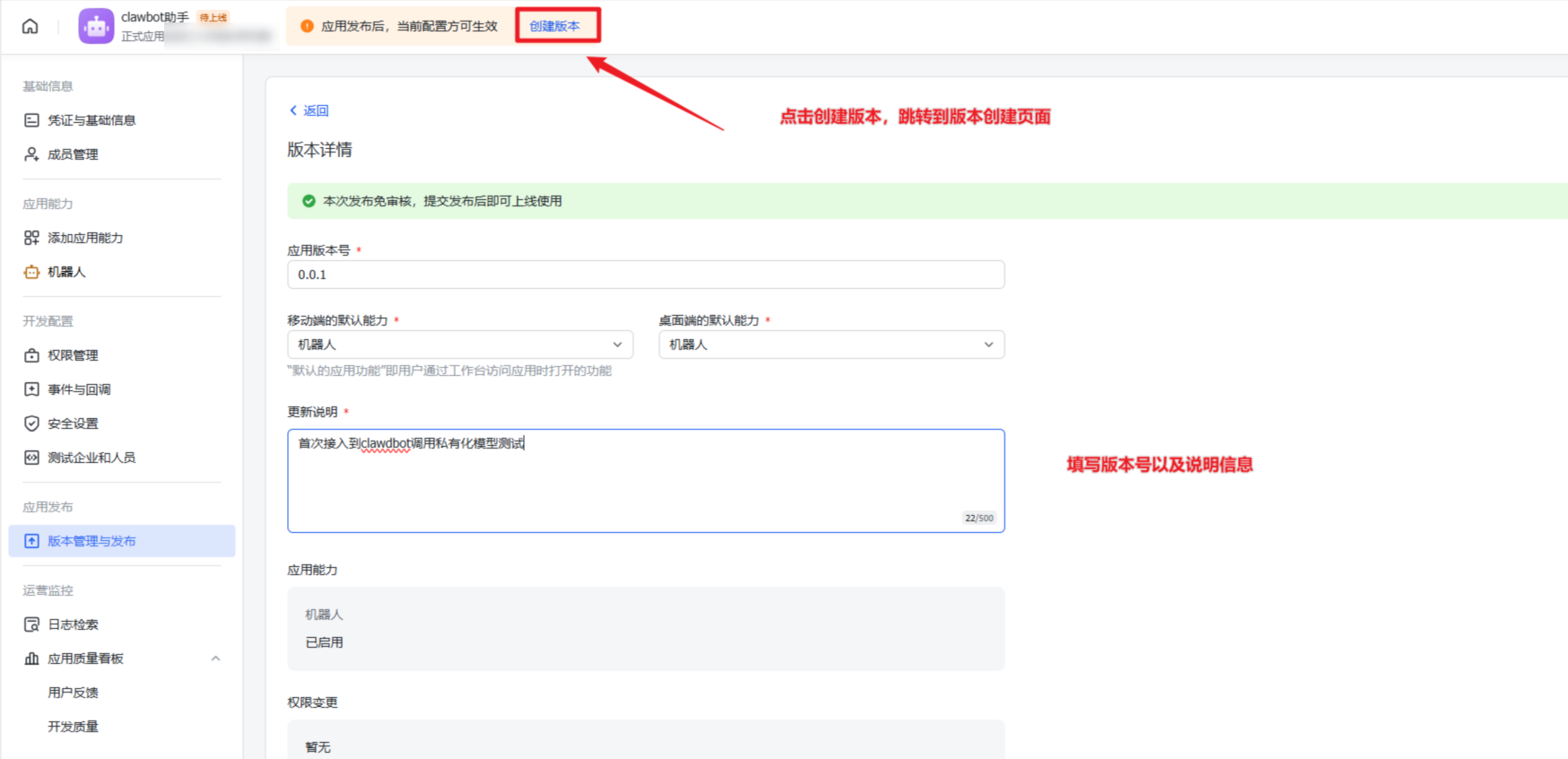 开通权限后,记得在 "应用发布" 中重新发布一个新的版本,配置才会正式生效。