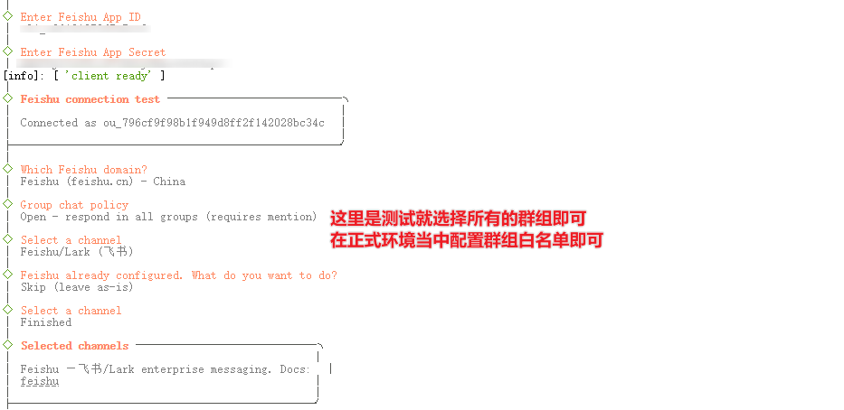 根据提示,填入刚才在飞书后台获取的 App ID 和 App Secret。