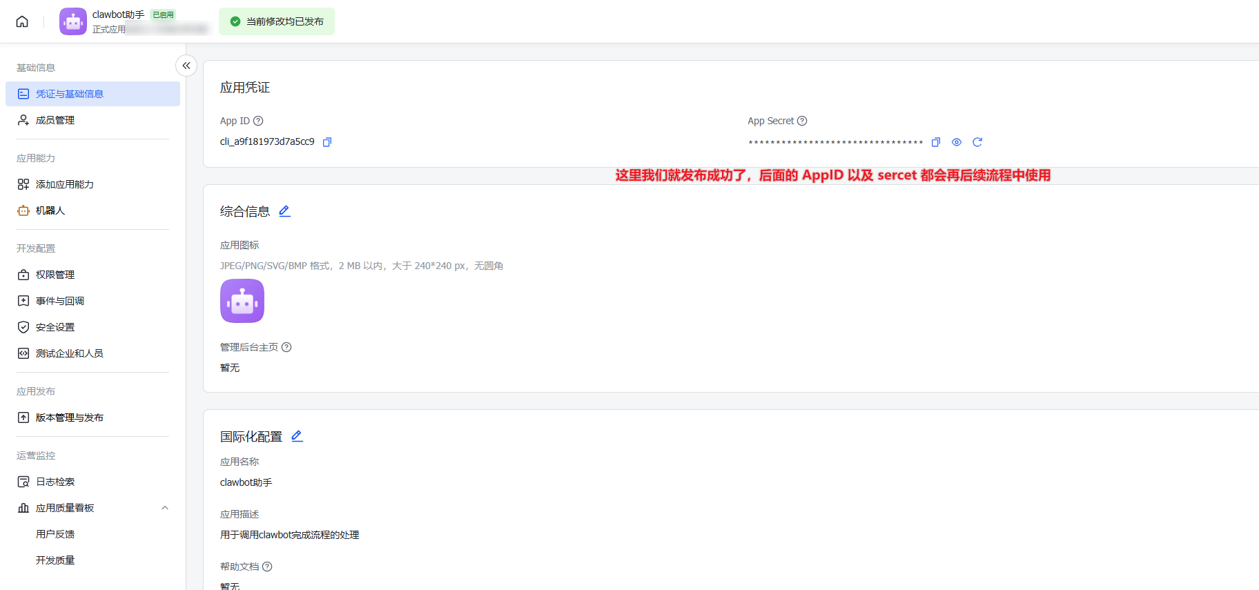 在 "凭证与基础信息" 页面,找到并保存你的 App ID 和 App Secret,稍后将配置到 Clawdbot 中。