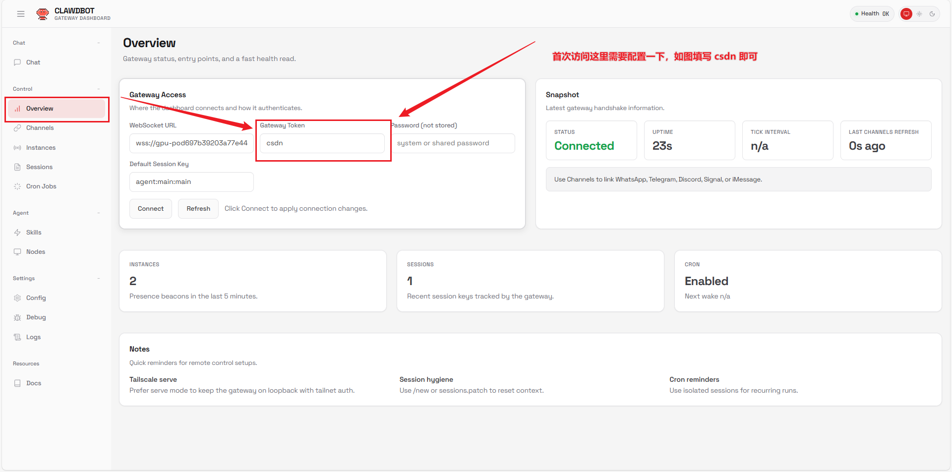 首次进入需要填写 csdn 到网关 toke 当中,在二图的 Config 页面添加配置自己的飞书 AppId & AppSecret 即可进入到当前平台