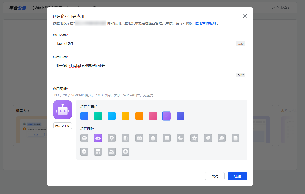 提示:此处的名称和头像将直接显示在飞书工作台及聊天界面中,建议上传一个具有辨识度的图标。