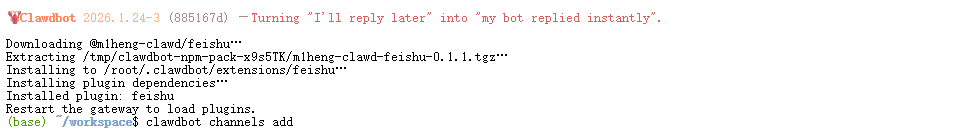 回到星图云服务器终端,利用 Clawdbot 的插件管理功能一键安装飞书连接器。