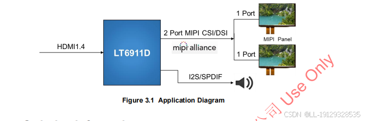 对于MIPI DSI/CSI输出,LT6911D具有可配置的单口或双口MIPI DSI/CSI,具有1个高速时钟通道,以及1~4个高速数据通道,最大运行速度为2Gbps/通道,可支持高达16Gbps的总带宽。LT6911D支持突发模式DSI视频数据传输,还支持灵活的视频数据映射路径。提供两种数字音频输出接口,I2S 和 SPDIF。I2S 接口支持 8 通道 LPCM,SPDIF 接口支持 2 通道 LPCM 或压缩音频,均以 192kHz 的最大采样率。