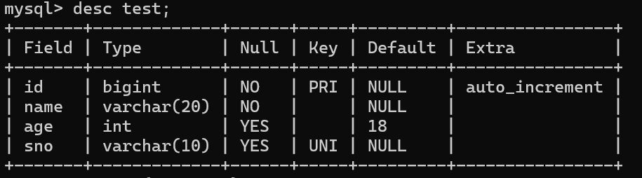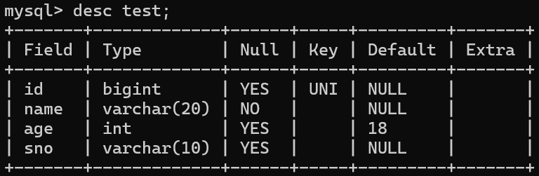 查看表结构会发现被修饰的字段在Default列有对应默认值标注