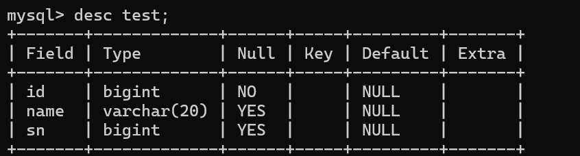 mysql> create table test(