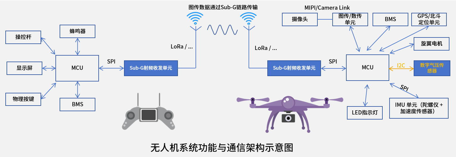 如无人机系统功能与通信架构示意图所示,无人机高度的精准控制并非通过单一功能单元即可完成,而是要依赖多源信息融合。